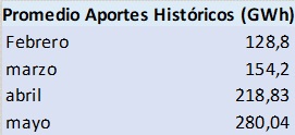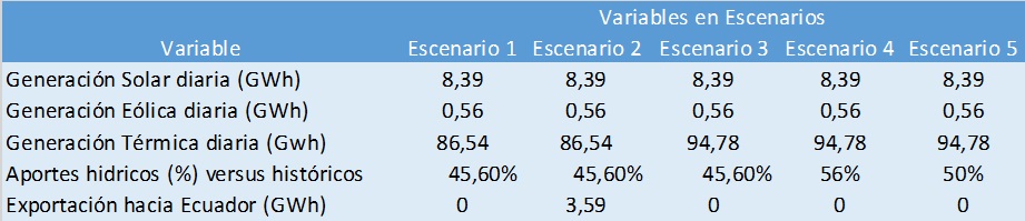 Además, en la tabla 2 se muestran las demandas diarias de energía, dependiendo del día de la semana, para calcular la proyección, tomadas del promedio del último mes, por lo cual deberían ser cercanas a las que se presentarán en los siguientes dos meses. También se incluyó un 0,22% de pérdidas por evaporación y otros factores. En la tabla 3 se muestran los aportes históricos usados para los próximos dos meses, y basados en estos realizar las proyecciones. En la figura 2 se muestran los resultados de cada uno de los escenarios.