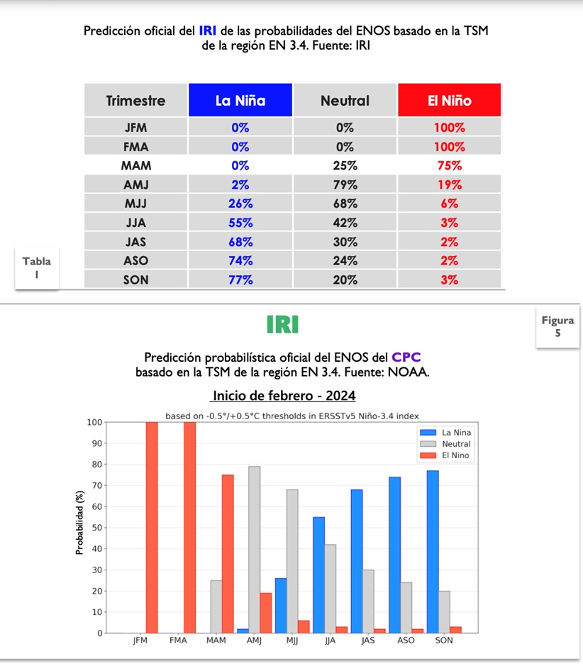 Según las predicciones de IRI y NOA, ver figura 5, y las predicciones del IDEAM para Colombia, en abril de 2024 todavía estará presente el fenómeno del niño, y se presentarán precipitaciones por debajo de lo normal, en las zonas donde están los embalses más importantes del país como Antioquia, Valle del Cauca, y Santander. En mayo, según dichas predicciones, es bastante probable que se presente neutralidad, y en el segundo semestre del 2024 tener un fenómeno de la niña, caracterizado por lluvias por encima del promedio histórico.