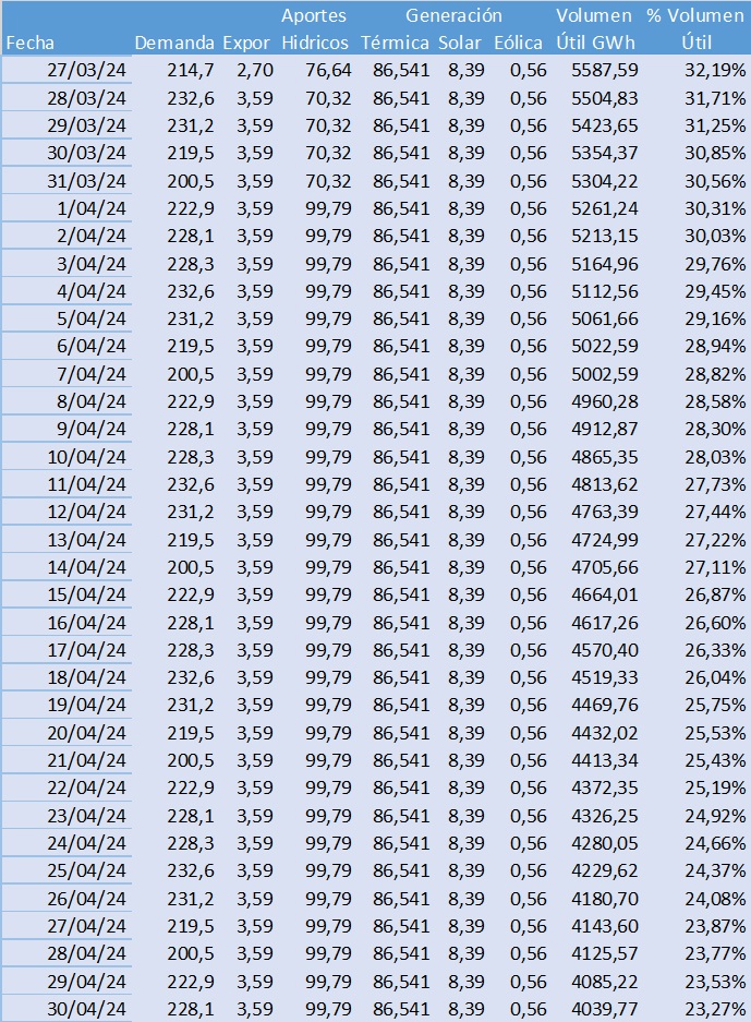 Cambiar el despacho durante estos dos meses (abril y mayo), buscando maximizar la generación térmica. Esto seguramente implicaría cambiar la regulación para priorizar estos recursos, incluyendo un sistema de control de precios, para evitar la especulación por parte de los generadores favorecidos.